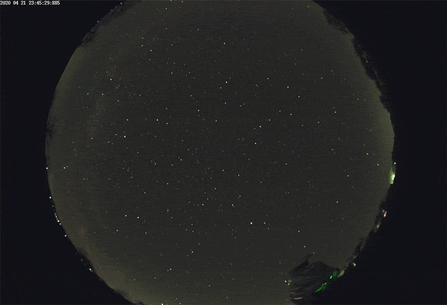 Z meteorů, které byly velmi jasné a poznamenal jsem si je, jsem na snímcích celooblohovým objektivem našel dva ze tří. Naopak na jednom snímku je pěkná stopa, u které lze s velkou pravděpodobností tvrdit, že jde také o Lyridu, možná o ní bude mít záznam někdo z kolegů. V menším zorném poli citlivého Canonu 6D se bohužel žádný jasný kousek neobjevil. Vizuálně jsem jich zaznamenal několik, ale prokazatelně jsem zatím dohledal jediný, který nebyl slabý, ale ani zdaleka nedosahoval jasu kousků, co jsou na celooblohovce a co zanechávaly stopu. Přikládám snímky.