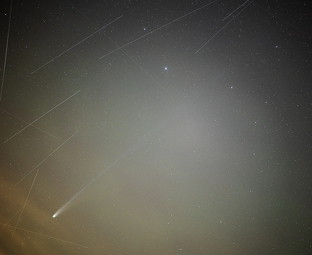 Nejzásadnějším problémem, kterého jsme si letos u sledování komety Lemmon všimli je fakt, že se promítá do blízkosti vláčků Starlinků. Extrém byl tento večer, kdy vlevo od komety svítily neustále i okem velmi výrazné pohybující se hvězdy. Na snímcích mám mnoho družic a na snímku teleobjektivem je vidět, že jsem chytl i jeden solidní vlak. V dalších letech to bude ještě horší, budeme si muset zvykat, že nerušenému pozorování komet, kde vadí Starlinky asi nejvíc (pozorujeme za soumraku), už pomalu odzvonilo. Přestože jsem byl v koridoru letadel, přeletěla mi tam jen dvě za celou dobu, to je úplně jiná liga než větší jednotky družic současně.