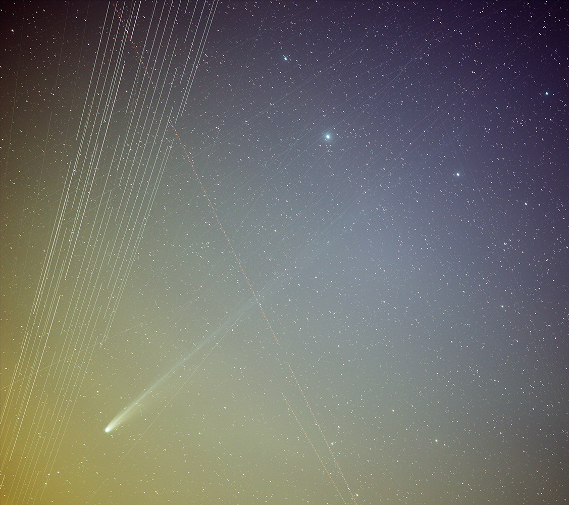 Starlinky na snímku s kometou – 15 složených snímků, vidět je celý vlak, který tam zrovna prolétal. Mnoho slabých už na finálních drahách je vidět všude ve snímku.