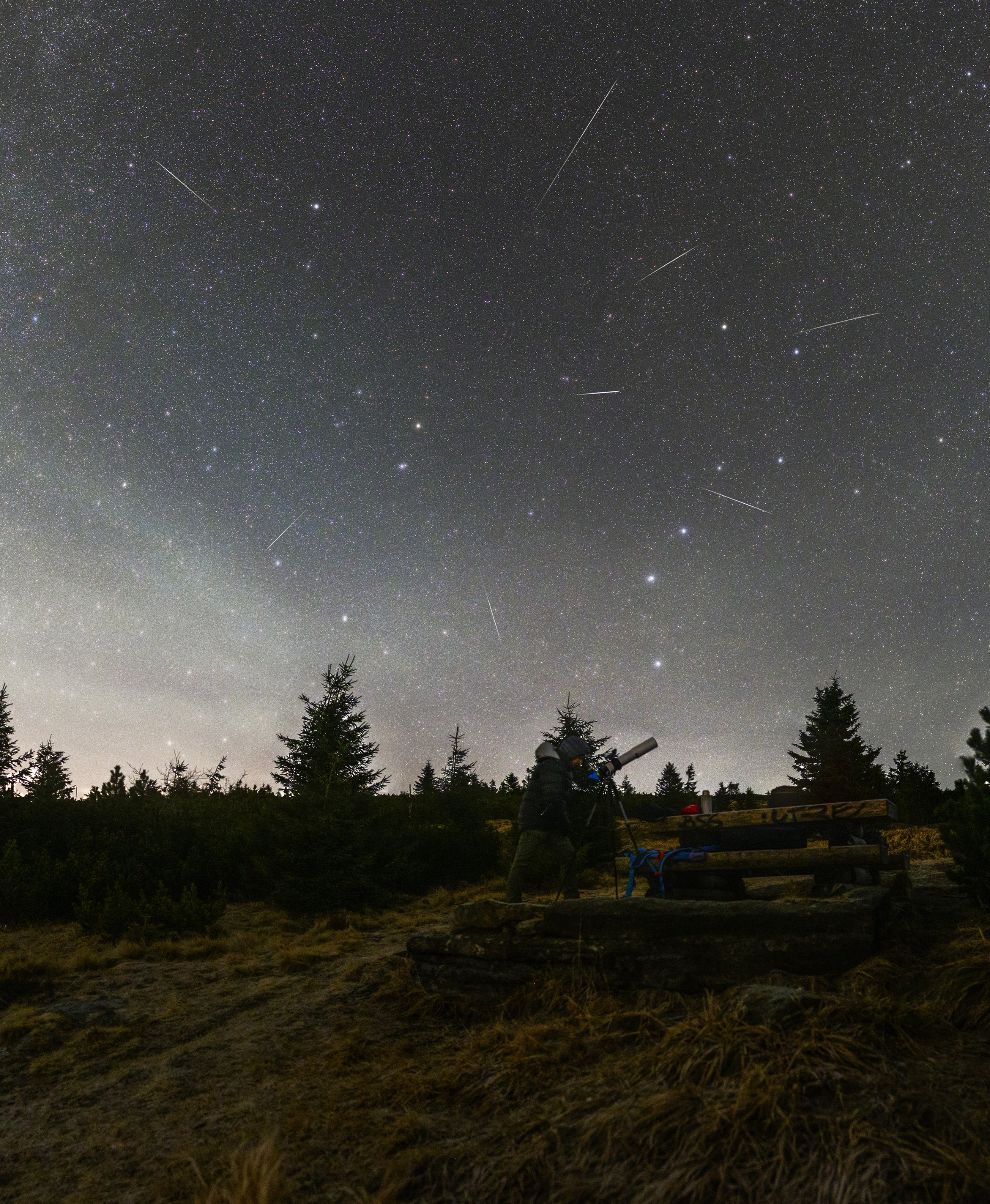 Několik zachycených Ursid v průběhu večera na Vrbatce – v popředí u lavičky „vizualista“ s malým refraktorem…