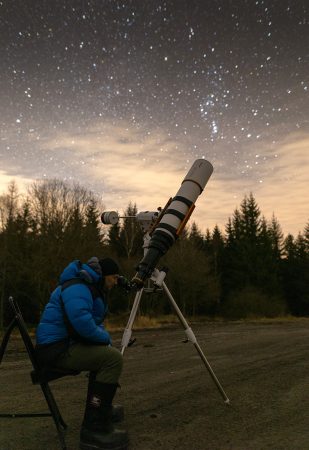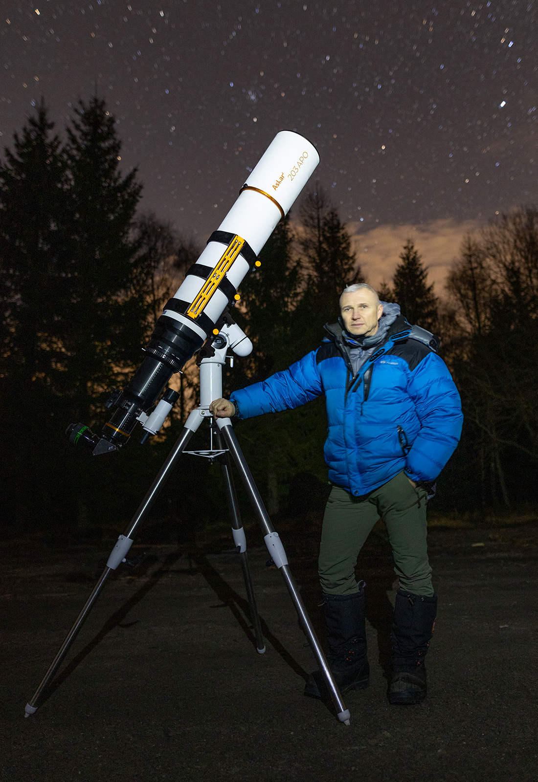 Nejprve to bylo v noci ze 17. na 18. prosince na oblíbené pozorovací stanoviště Rozdrože Izerskie na polské straně Jizerských hor. Zajímavý byl gradient teploty při přejezdu státní hranice – zatímco v Harrachove byla mlha, –3 °C a vše kolem ojíněno do bíla, přejezdem do Polska začala teplota rychle stoupat a palubní teploměr zaregistroval cca na 1 km nárůst teploty o 9 °C! Na Rozdrože bylo příjemně, bezvětří a nad severovýchodem nějaká oblačnost. Kuba tradičně vybalil své fotonádobíčko a já 8“ APO refraktor čínského výrobce Askar, laskavě zapůjčený k testování firmou SUPRA Optika. Obloha byla velmi slušná, hodnota SQM se ustálila kolem 21,3 MSA. Díky masivnímu tří čočkovému objektivu „Oskara“, jak tuto 23,5 kg těžkou a dlouhou obludu familiárně přezdíváme, jeho temperace trvá i několik hodin. Proto jsem většinu času používal malé zvětšení 45x (TV Nagler 31 mm) k přehlídce jasných a profláknutých objektů zimní oblohy. Pohled na většinu objektů byl úchvatný – od spirálních ramen M33, přes výrazné reflexní mlhoviny Plejád, mlhovinu Rosetta až po klenot v podobě M42 s jemnými strukturami vláken mlhoviny, a to vše s hvězdami dokonale bodovými až do krajů téměř dvoustupňového zorného pole.