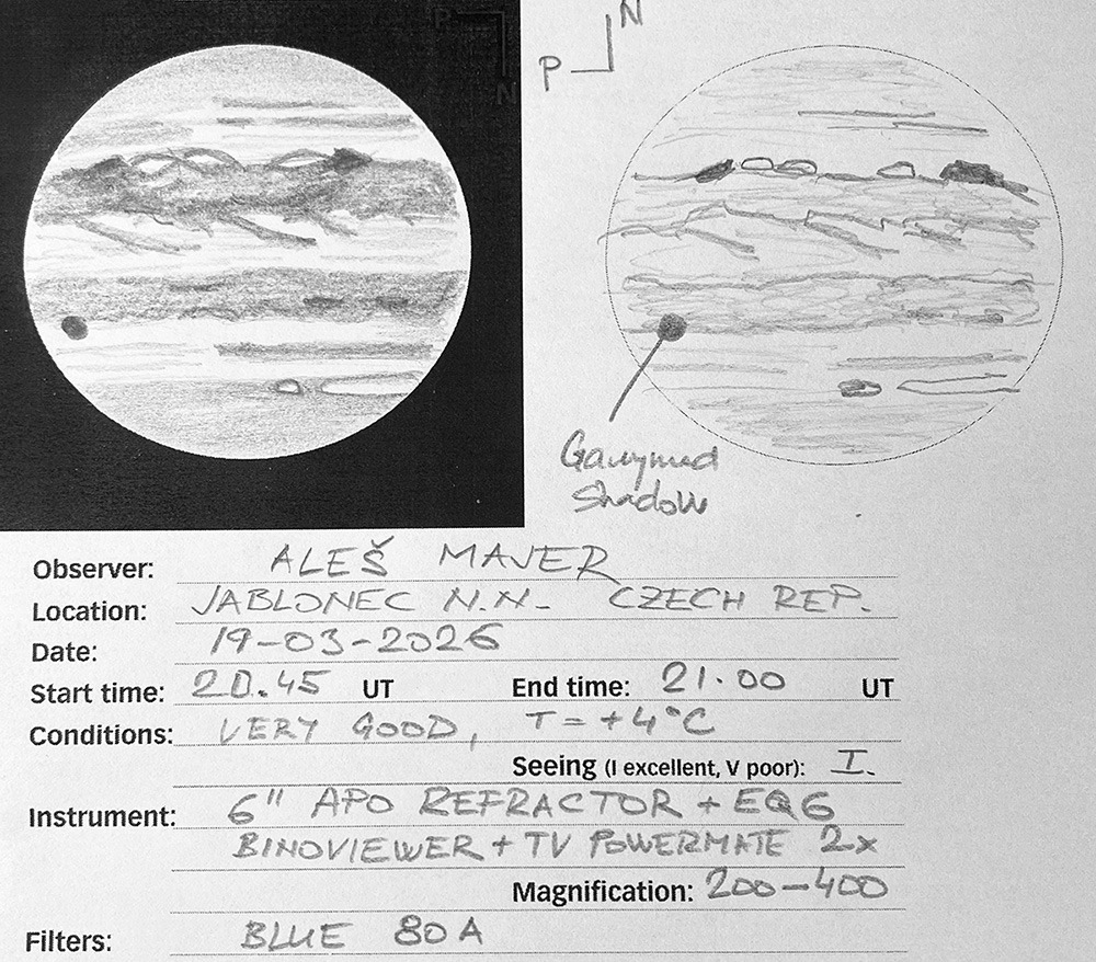 Následujícího večera (19. 3.) jsem pozoroval doma na zahradě. Zvažoval jsem vytáhnout 20“ dobson, ale nakonec zvítězila lenost (protože jsem nevěřil, že by podobně klidná atmosféra mohla být i druhý večer po sobě…) a postavil jsem jenom 6“ apo refraktor na EQ6. První pohled na Jupiter přesvědčivý nebyl, seeing lehce nadprůměrný (Ant. II–III), GRS jasně viditelná a ve středu disku velký černý stín Ganymedův. Obraz se však stále zlepšoval až se ustálil na Ant. II a chvílemi opět i Ant. I. Používal jsem rovněž binohlavu a zvětšení 200x, 240x, 300x a 400x. Nemohl jsem se od okuláru odtrhnout a asi hodinu sledoval, jak GRS zapadá a stín se pomalu sune k okraji disku. Nepravidelná rozeklanost NEB s řadou ztemnění a zesvětlení se prostě neokouká. Také jsem zkoušel filtry – světle modrý 80A a kontrast booster. Na závěr jsem se pokusil zachytit vizuální vjem skicou. Myslím, že za tyto dva večery to byl nejlepší Jupiter letošní opozice, ne-li jeden z nejlepších, jaké jsem kdy vůbec viděl…