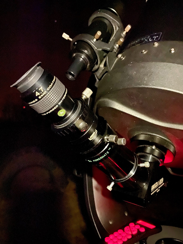 No ale vysoko nad hlavou svítil král dnešní noci, resp. Králomoc, jak zní staročeský název Jupiterův. Tady jsem nasadil binohlavu a jen měnil okuláry a pak přidával prodlužovací optické členy. Obraz (Ant. I) při 280x fantastický, při 466x stále výborný s jemnými detaily, 933x začíná obraz trochu měknout, ale stále velmi dobrý kontrast i detaily. Napadá mě ukrutná zhovadilost – do zenitového zrcátka zasouvám TV Powermate 2x, do něj Baader barlow 2,25x a do něj okulár ES 4,7 mm – zvětšení 2 680x!!!