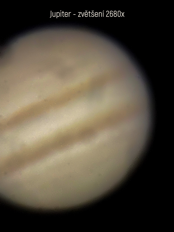 Pokus o vyfocení Jupiteru mobilem za okulárem při zvětšení 2 680x.