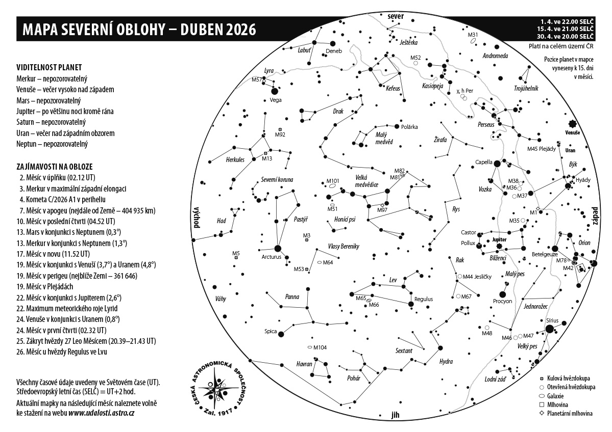 Hlavním lákadlem dubnové oblohy jsou bezesporu jasné komety – více v textu na druhé straně mapky…